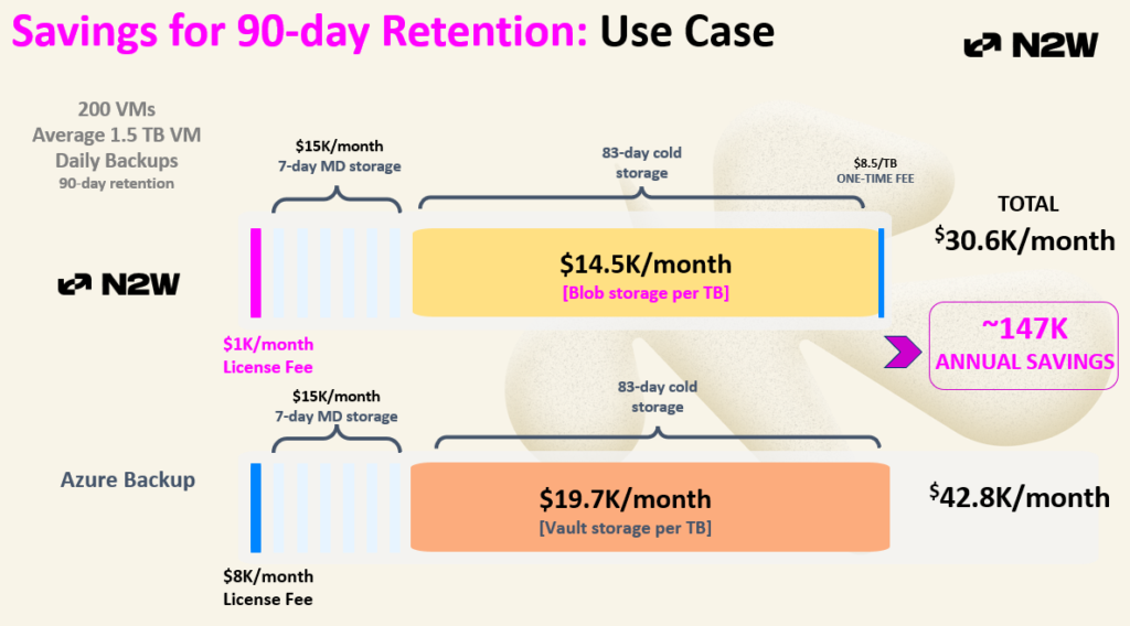 The calculator lives on our website under the Resources tab. It takes your environment inputs (VM count, sizes, change rates, retention policies) and calculates a full total cost of ownership comparison between your current Azure Backup setup and what you’d pay with N2W. It accounts for all N2W costs (licensing fees, processing costs) so the savings figure you see is net of everything.